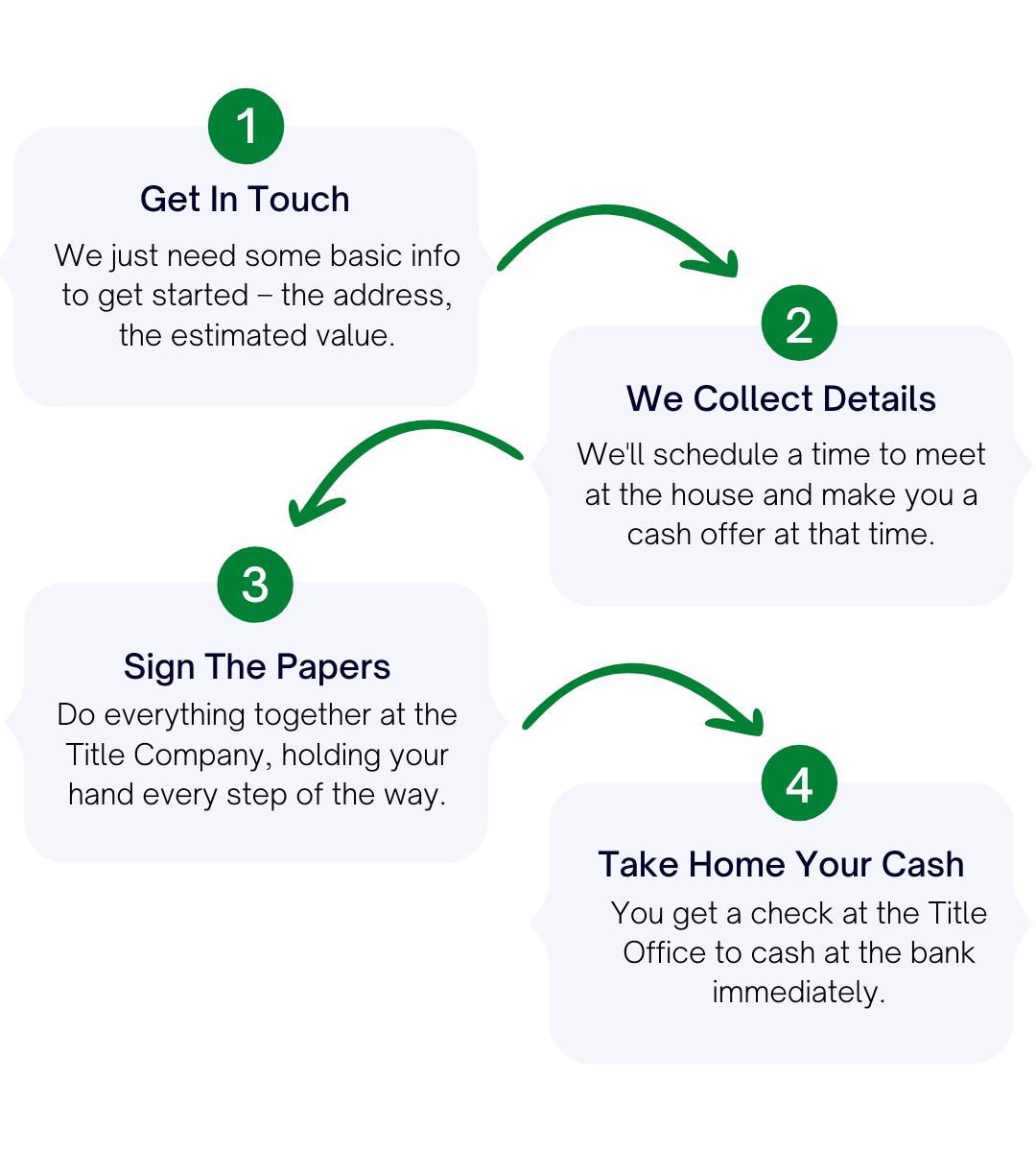 A: If you provide us with all the information we need during the initial phone call, all the paperwork is completed promptly, you have clear title, and there are no problems, we can often complete the purchase of a property in seven days. However, to get the highest and best offer for your property, we typically take two to three weeks so we can complete our due diligence.